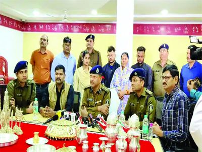 रायपुर ( शोर संदेश )। तेलीबांधा थाना क्षेत्र स्थित दिगंबर जैन मंदिर में हुई चोरी के मामले में पुलिस ने बड़ी कार्रवाई करते हुए तीन अंतर्राज्यीय आरोपियों को गिरफ्तार किया है। इन आरोपियों में एक महिला और उसके दो बेटे शामिल हैं, जो मध्य प्रदेश के भोपाल के निवासी हैं। चोरी किए गए करीब 15 लाख रुपये के सोने-चांदी के आभूषण और अन्य सामान बरामद कर लिए गए हैं।