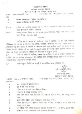 रायपुर (शोर संदेश)। प्रदेश में कोरोना का बढ़ते मामलों और नए वेरिएंट ओमीक्रॉन के खतरे को देखते हुए राज्य शासन ने नया निर्देश जारी किया है। इसमें नए वर्ष के आयोजन के लिए हॉल की क्षमता का केवल एक तिहाई इस्तेमाल की अनुमति होगी। यही नहीं आयोजन मैं दो सौ सै अधिक व्यक्ति होने पर कलक्टर से पहले से लिखित अनुमति लेनी होगी। सामान्य प्रशासन विभाग की और से सभी संभागायुकत, आईजी, कलेक्टरों और एसपी को निर्देश जारी किया गया है।