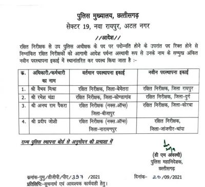 रायपुर (शोर संदेश)। निरीक्षक से डीएसपी के पदों पर प्रमोट हुए 4 रक्षित निरीक्षकों को पुलिस महानिदेशक डीएम अवस्थी ने अब नई जिम्मेदारी दी है। डीएसपी पदों पर प्रमोट हुए अफसरों को जिम्मेदारी देने के साथ रिक्त स्थानों पर नए निरीक्षकों को पदस्थ किया है। सोमवार को डीजीपी अवस्थी ने चार रक्षित निरीक्षकों को नई जिम्मेदारी दी है। रायपुर पुलिस लाइन की जिम्मेदारी डीजीपी अवस्थी ने वैभव मिश्रा को दी है। रायपुर के अलावा दुर्ग, कोरबा व जांजगीर में नए रक्षित निरीक्षक को नियुक्ति किया गया है। दुर्ग की जिम्मेदारी रमेश चंद्रा को, कोरबा की जिम्मेदारी अनथ राम पैकरा को और जांजगीर की जिम्मेदारी प्रदीप जोशी को दी है।