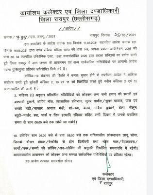 रायपुर (शोर सन्देश)। राजधानी रायपुर में लगातार कम होते क्रोनस संक्रमण के मामलों के चलते कलेक्टर सौरभ कुमार ने लॉकडाउन की गाइडलाइन में थोड़ी छूट और बधाई है। कलेक्टर ने आदेश जारी कर रात 8 बजे तक दुकानों को खोलने की अनुमति दी है। रायपुर में रात 8 बजे से सुबह 6 बजे तक नाइ कर्फू लागू रहेगा।