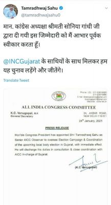 रायपुर (शोर सन्देश)। छत्तीसगढ़ के गृहमंत्री ताम्रध्वज साहू को एआईसीसी ने बड़ी जिम्मेदारी दी है। एआईसीसी के महासचिव केसी वेणुगोपाल ने प्रेस विज्ञप्ति जारी इसकी जानकारी दी है। गृहमंत्री साहू को कांग्रेस ने गुजरात लोकल बॉडी इलेक्शन का सीनियर ऑब्जर्वर नियुक्त किया है। पार्टी की ओर से मिले इस दायित्व के लिए ताम्रध्वज साहू ने पार्टी के प्रति अपनी कृतज्ञता व्यक्त की है।