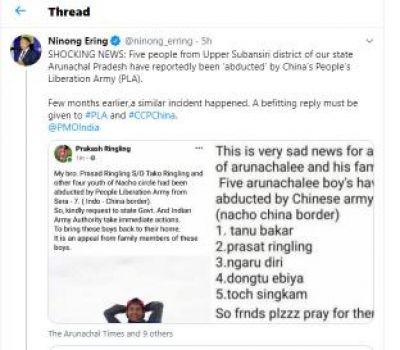 अरुणाचल प्रदेश के कांग्रेस विधायक निनॉन्ग एरिंग का दावा है कि प्रदेश के ऊपरी सुबनसिरी जिले के पांच लोगों का कथित तौर पर चीन की सेना(पीएलए) ने अपहरण कर लिया गया है। कुछ महीने पहले भी ऐसी घटना घटी थी। सरकार को चीन की सेना को जवाब देना चाहिए। इसको लेकर निनॉन्ग ने पीएमओ को भी ट्वीट को टैग किया है और जानकारी दी है।