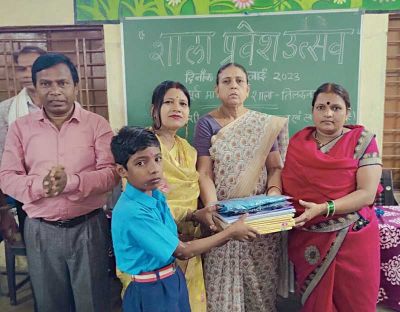 रायपुर (शोर संदेश)। शासकीय पूर्व माध्यमिक शाला तिलकनगर, गुढ़ियारी में शनिवार को शाला प्रवेशोत्सव आयोजित हुआ। उत्सव में नव प्रवेशी छात्र-छात्राओं को तिलक लगाकर और मिठाई खिलाकर पुस्तक व गणवेश प्रदान किया गया।इस अवसर पर वार्ड पार्षद श्रीमती कामिनी देवांगन,शाला अध्यक्ष देवराज साहू, प्रधानपाठक लच्छुराम निषाद, संकुल समन्वयक कमल साहू, उपाध्यक्ष हेमलता साहू, वरिष्ठ शिक्षक सरोज मिश्रा, मनमत भारती, अनिता साहू, निर्मला चावड़ा, चन्द्रप्रिया गोस्वामी, रेहाना सिद्दीकी, नीता ठाकुर एवं विद्यार्थीगण उपस्थित थे।