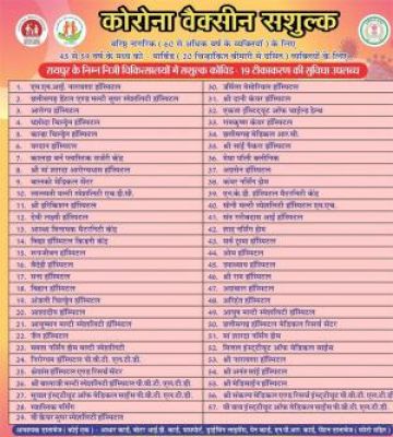 रायपुर (शोर सन्देश)। छत्तीसगढ़ की राजधानी रायपुर शहर के 57 निजी अस्पतालों को कोविड-19 का टीका लगाये जाने के लिए अनुमन्य किया गया है। राज्य में 16 फरवरी 2021 से टीकाकरण की शुरूआत हुई थी। पहले चरण में कोरोना वारियर्स को टीका लगाया गया था। इसके बाद 60 वर्ष से ऊपर की उम्र के लोगों के लिए टीका लगाया जा रहा है। 1 अप्रैल से 45 वर्ष की उम्र से अधिक लोगों को कोविड-19 का टीका लगाया जाएगा। जिन निजी अस्पतालों को रायपुर शहर में अनुमन्य किया गया है उनकी सूची देंखे--