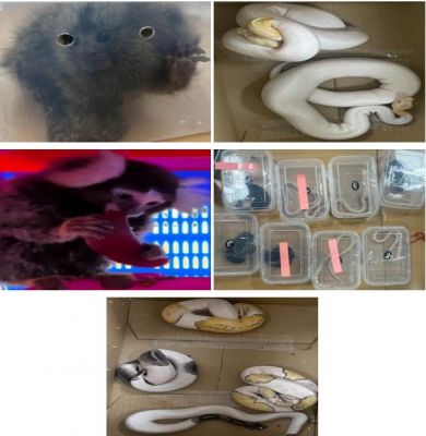 बरामद किए गए जानवरों में पीले और हरे रंग के एनाकोंडा, पीले सिर वाले अमेजन तोते, रेड फुट कछुआ, इगुआनास, बॉल पाइथन, एलीगेटर गार, याकी बंदर, गिरगिट, रैकून डॉग जैसे अत्यंत दुर्लभ और खतरे वाले जानवर शामिल हैं।