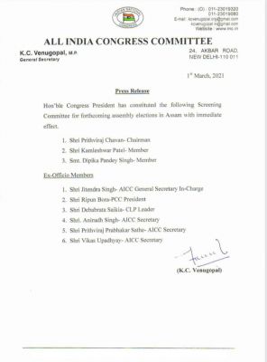 रायपुर/नई दिल्ली (शोर सन्देश)। असम चुनाव का ऐलान होने के बाद कांग्रेस जीत के लिए पूरी ताकत झोंक रही है। चुनाव के मद्देनजर छत्तीसगढ़ के मुखिया भूपेश बघेल, संसदीय सचिव विकास उपाध्याय सहित तमाम नेता चुनावी मैदान में जमकर पसीना बहा रहे हैं। इसी बीच कांग्रेस ने असम चुनाव के लिए स्क्रीनिंग कमेटी का गठन किया है। इस कमेटी में पृथ्वीराज चौहान को अध्यक्ष बनाया गया है। जबकि ससंदीय सचिव विकास उपाध्याय को सदस्य के तौर पर शामिल किया गया है।