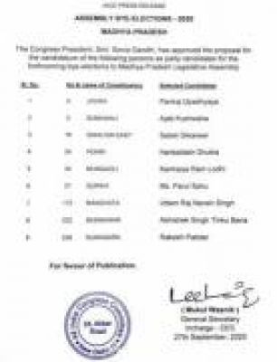 रायपुर (शोर सन्देश) । कांग्रेस ने मध्यप्रदेश और उत्तर प्रदेश में उपचुनाव के प्रत्याशियों की लिस्ट जारी की है ग्वालियर ईस्ट से सतीश सिकरवार को टिकट और पोहरी से हरिश बल्लभ शुक्ल तो के बांगरमऊ से आरती वाजपेई को मिला टिकट है। देखे सूचि
