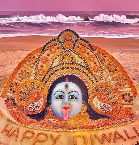 भुवनेश्वर (शोर संदेश)।देशभर में दिवाली का त्योहार धूमधाम से मनाया जा रहा है। दिवाली के मौके पर पद्मश्री विजेता सैंड आर्टिस्ट सुदर्शन पटनायक ने अपने अंदाज में दिवाली की शुभकामनाएं दी हैं। सुदर्शन पटनायक ने ओडिशा के पुरी बीच पर मां काली की रेत से खूबसूरत मूर्ति बनाई है। रेत की मूर्ति बनाने में उन्होंने हजारों दीयों का इस्तेमाल किया है। सुदर्शन पटनायक ने रेत से बनाई मां काली की मुर्ति ट्वीट भी की है। उन्होंने अपने ट्विटर अकाउंट से मां काली की तस्वीर ट्वीट की है। उन्होंने ट्वीट कर लिखा, 'हैप्पी दिवाली... ओडिशा के पुरी बीच पर 4045 दीयों से मां काली की रेत से मूर्ति बनाई है।'
