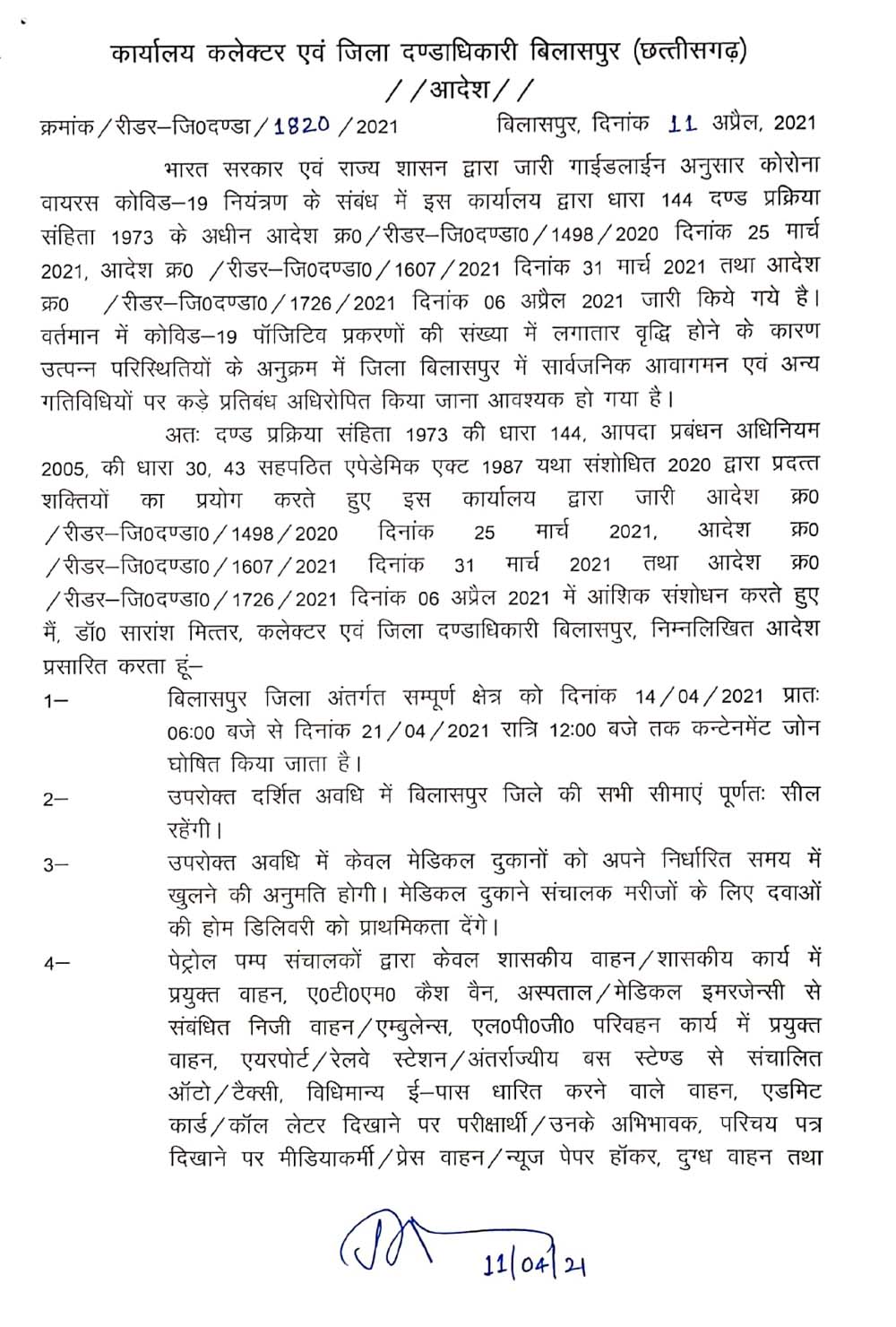 बिलासपुर (शोर सन्देश)। छत्तीसगढ़ का एक और महत्वपूर्ण जिले बिलासपुर में भी लाकडाउन होने जा रहा है। प्रदेश में अब तक 12 जिलों में लाॅकडाउन लग चुका है। कोरोना के बढ़ते संक्रमण को लेकर कलेक्टर अब सख्त कदम उठाने जा रहा है। कोराना प्रकरण के पाॅजिटिव मरीज की संख्या में लगातार वृद्धि होने कारण बिलासपुर जिला में सार्वजनिक आवागमन और अन्य गतिविधियों पर कड़े प्रतिबंध किए जाने की आवश्यकता हो गया है। जिसके तहत कलेक्टर ने 14 अप्रैल सुबह 6 बजे से 21 अप्रैल रात्रि 12 बजे तक कन्टेनमेंट घोषित किया है। 13वें जिले के रूप में अब बिलासपुर में लाॅकडाउन लग गया है। इस दौरान संपूर्ण जिला 8 दिनों के लिए बंद रहेगा। हालांकि अन्य जिलों से आमलोगों को यहां थोड़ी राहत होगी। बंद के दौरान सिर्फ अति आवश्यक जैसे पेट्रोल पंप, मेडिकल स्टोर, दूध, अखबार बांटने की ही छूट रहेगी। शनिवार की रात इस संबंध में महत्वपूर्ण समीक्षा बैठक में यह निर्णय लिया गया है। बैठक के बाद आज रविवार को लाकडाउन पर विस्तृत गाइडलाइन जारी किया गया है। गौरतलब है कि इससे पहले कलेक्टर ने बाजारों के वक्त में बदलाव कर और नाईट कर्फ्यू के जरिए कोरोना को कंट्रोल करने की कोशिश की थी, लेकिन कोरोना का संक्रमण बढ़ता ही जा रहा था। आलम यह रहा कि रोज कोरोना संक्रमित मरीजों की संख्या इस साल में सबसे ज्यादा बढ़ रही है।