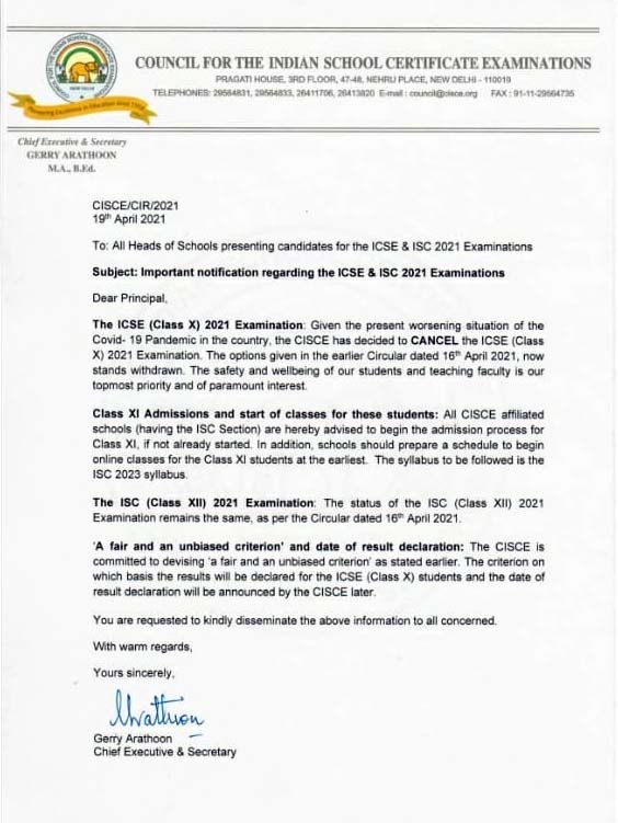 नई दिल्ली (शोर सन्देश)। कोरोना के कारण अब सीआईएससीई बोर्ड ने 10वीं की परीक्षाएं रद्द कर दी हैं। पहले बोर्ड के नोटिफिकेशन में कक्षा 10वीं के छात्रों के लिए परीक्षा वैकल्पिक रखी गई थी। कक्षा 10वीं के जो छात्र परीक्षा में उपस्थित नहीं होना चाहते हैं, बोर्ड उनके लिए विशेष मूल्यांकन पद्वति से परिणाम तैयार करेगा. वहीं, जो छात्र परीक्षा देना चाहते हैं वे कक्षा 12वीं के छात्रों के साथ परीक्षा में भाग ले सकेंगे। सीआईएससीई बोर्ड की ओर से पहले ही 12वीं की परीक्षाएं स्थगित करने की घोषणा की जा चुकी है। बोर्ड की ओर से कहा गया था कि कक्षा 12 परीक्षा (ऑफलाइन) बाद में आयोजित की जाएगी। इसके लिए जून में तारीख घोषित की जा सकती है। सीआईएससीई बोर्ड की 10वीं की परीक्षा 04 मई से शुरू होने वाली थी। इसका आखिरी पेपर 07 जून को होना था, जबकि 12वीं की परीक्षा 8 अप्रैल से जारी थी और इसका समापन 18 जून को होना था। बता दें कि सीआईएससीई दो बोर्ड्स से मिलकर बना है। इसके तहत 10वीं की परीक्षा आईसीएसई बोर्ड के और 12वीं की आईएससी बोर्ड के अंतर्गत होती है।
