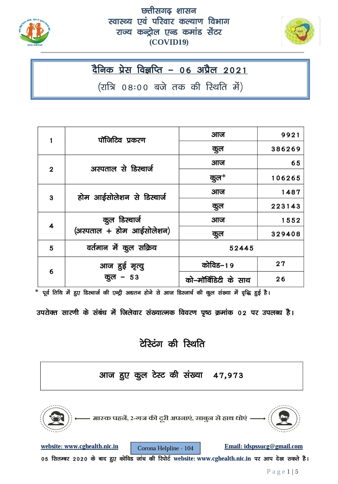 रायपुर (शोर सन्देश)। कोरोना संक्रमण के दिन बा दिन बढ़ते प्रकोप का आप इस बाद से अंदाजा लगा सकते है कि आज की मौत का आंकड़ा अब तक की दर्ज हुई सर्वाधिक संख्या है। प्रदेश में आज कुल 53 मौत दर्ज हुई है, जिनमे 27 मामले कोविड श्रेणी की है तथा 26 मामले को-मोर्बिडिटी श्रेणी के है। प्रदेश में आज 9,921 नए कोरोना पॉजिटिव मरीज़ों की पहचान हुई है। वहीं 1,552 मरीज़ स्वस्थ होने के उपरांत डिस्चार्ज हुए। राज्य में एक्टिव मरीज़ों की संख्या 52,445 है।राजधानी रायपुर में भी आज सर्वाधिक संक्रमित मिले है। आज 2821 नए संक्रमितों की पुष्टि हुई है।