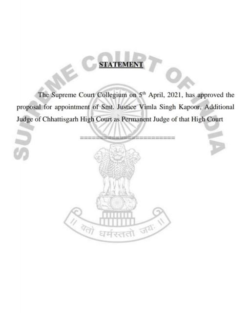 रायपुर (शोर सन्देश))। सुप्रीम कोर्ट कॉलिजियम ने छत्तीसगढ़ हाईकोर्ट में अतिरिक्त न्यायाधीश जस्टिस विमला सिंग कपूर को स्थाई न्यायाधीश नियुक्त के प्रस्ताव को स्वीकार किया है। विमला सिंह कपूर छतीसगढ़ हाइकोर्ट में पहली आदिवासी महिला जज हैं।इसके पहले बिलासपुर हाईकोर्ट में अतिरिक्त न्यायधीश बनाए जाने के बाद अपने शपथ ग्रहण के दौरान जस्टिस विमला सिंह कपूर ने कहा था कि यूं तो आदिवासी समाज में पढ़ाई-लिखाई का विशेष चलन नहीं है, लेकिन मैं अपने आपको खुशनसीब मानती हूं कि इस मुकाम तक पहुंची हूं। उन्होंने इसके लिए अपने माता-पिता, परिजनों और पूर्वजों को देते हुए कहा कि उनकी इच्छा यही है कि लोगों के हित के लिए काम करुं और वंचितों को न्याय दिलाने के लिए कुछ कर सकूं।