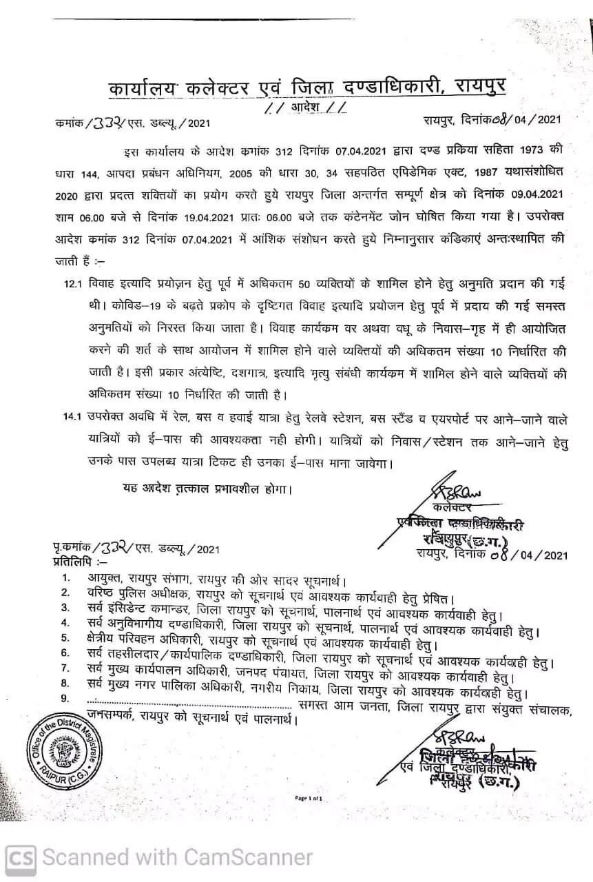 रायपुर (शोर सन्देश)। कोरोना के प्रसार पर रोक लगाने राजधानी रायपुर में 9 से 19 अप्रैल तक लॉक डाउन लगाया गया है। कलेक्टर ने आंशिक संशोधन कर कुछ कंडिकाएं जोड़ी है। विवाह इत्यादि प्रयोजन के लिए पूर्व में 50 व्यक्तियों के शामिल होने के लिए अनुमति प्रदान की गई थी। कोविड-19 के बढ़ते प्रकोप को ध्यान में रखते हुए विवाह इत्यादि प्रयोजन के लिए पूर्व में प्रदान की गई समस्त अनुमतियों को निरस्त किया गया है। विवाह कार्यक्रम वर या वधु के निवास में ही आयोजित करने की शर्त के साथ आयोजन में शामिल होने वाले व्यक्तियों की अधिकतम संख्या 10 निर्धारित की गई है। इसी प्रकार अंत्येष्टि, दशगात्र इत्यादि मृत्यु संबंधी कार्यक्रम में शामिल होने वाले व्यक्तियों की अधिकतम संख्या 10 निर्धारित की गई है। उपरोक्त अवधि में रेल, बस व हवाई यात्रा के लिए रेलवे स्टेशन,बस स्टैंड और एयरपोर्ट पर आने जाने वाले यात्रियों को ई-पास की आवश्यकता नहीं होगी। यात्रियों को निवास स्टेशन तक आने जाने के लिए उनके पास उपलब्ध यात्रा टिकट ही उनका ही पास माना जाएगा।