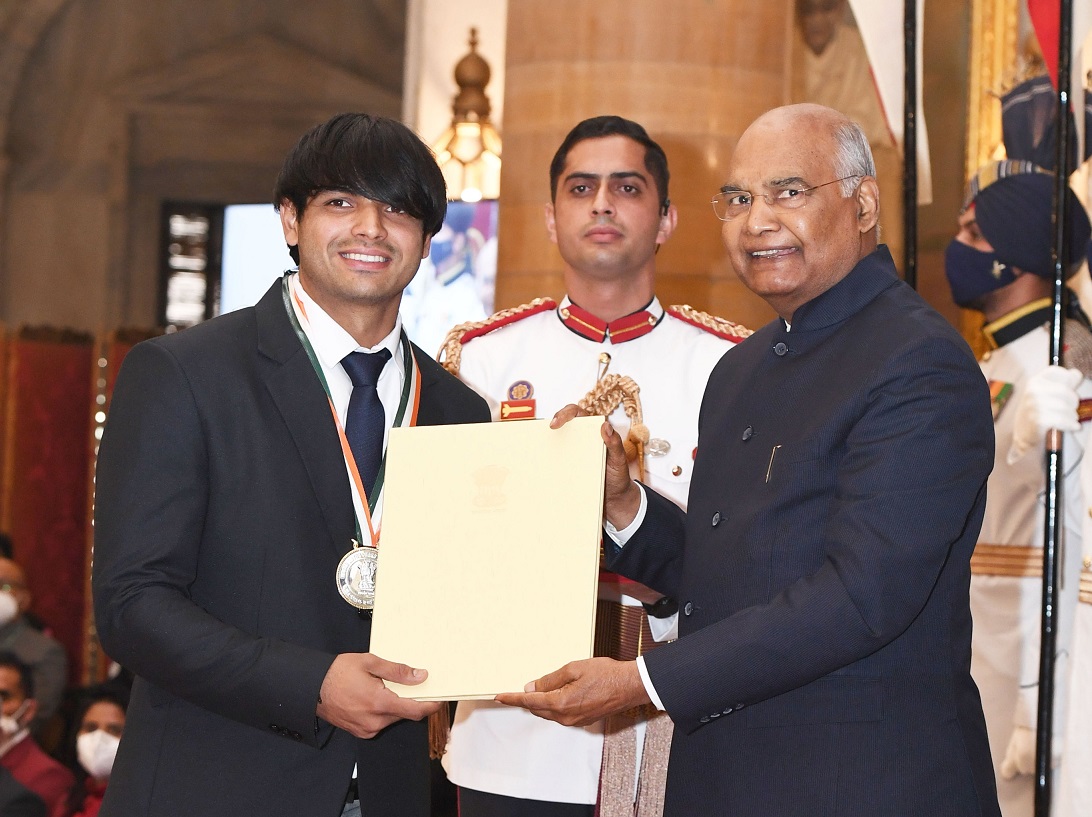 नीरज चोपड़ा को राष्ट्रपति रामनाथ कोविंद ने मेजर ध्यानंचंद खेल रत्न से सम्मानित किया।