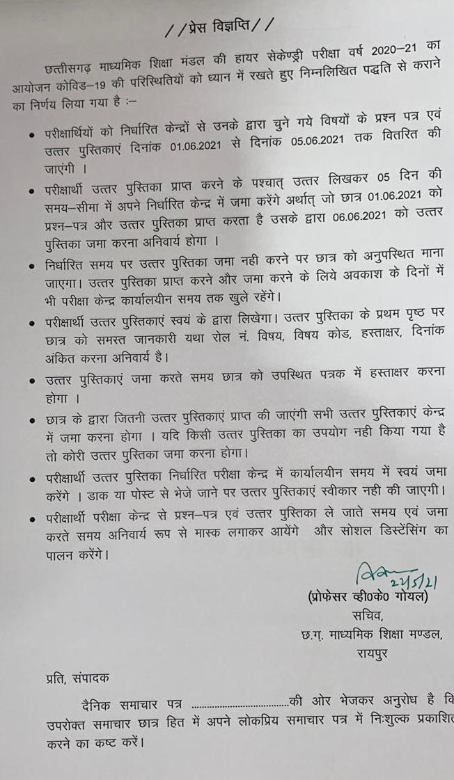 रायपुर (शोर सन्देश)। छग माध्यमिक शिक्षा मंडल ने हायर सेकेंडरी परीक्षा वर्ष 2020-2021 का आयोजन कोविड प्रोटोकॉल के तहत आयोजित करने का निर्णय लिया है। माशिम ने इसके लिए दिशा निर्देश जारी कर दिए है। जारी आदेश में बताया गया है कि परीक्षार्थी अपने चुने गए केंद्रों से 1 से 5 जून के बीच प्रश्न पत्र व उत्तर पुस्तिका प्राप्त कर सकते है। पुस्तिका प्राप्त होने के 5 दिवस के अंदर छात्रों को इसे भरकर अपने केंद्रों में जमा करना अनिवार्य है। अगर कोई छात्र 5 दिनों के बाद पुस्तिका जमा करता है तो उसे अनुपस्थित घोषित कर दिया जाएगा। परीक्षार्थी उत्तर पुस्तिकाएं स्वयं के द्वारा लिखेगा। उत्तर पुस्तिका के प्रथम पृष्ठ पर छात्र को समस्त जानकारी यथा रोल नं. विषय, विषय कोड, हस्ताक्षर, दिनांक अंकित करना अनिवार्य है।
