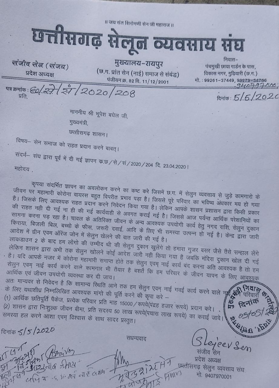 नारायण प्रसाद सेन रायपुर (शोर संदेश) सेलून व्यवसाय करने वाले ऐसे लोग होते हैं जो रोज कमाते हैं और रोज उसी आय से अपने घर परिवार का खर्चा चलाते हैं | छत्तीसगढ़ में लगातार प्रथम एवं द्वितीय लॉकडाउन के चलते लंबे समय से सेलून व्यवसाय बंद होने के कारण सेलून व्यवसायियों की आर्थिक स्थिति बद से बदतर हो चुकी है साथ ही सेलून व्यवसायियों को व्यवसाय करने हेतु कब तक अनुमति मिलेगी यह भी अभी अनिश्चित है | ज्ञात हो कि छत्तीसगढ़ में जब पहला लॉकडाउन 2020 में लगा था तब सेलून व्यवसाय संघ के प्रदेश अध्यक्ष संजीव कुमार सेन ने कहा था कि चुंकि सेलून व्यवसाई अभी तक सेवक के रूप में काम करते आए हैं तो उन्हें लॉकडाउन की इस विषम परिस्थितियों में सेलून व्यवसायियों को 15000 रुपये प्रति माह की आर्थिक मदद एवं 50 लाख रुपये का बीमा तथा सरकार की गाइडलाइन के अनुसार सैनिटाइजर, पी.पी.ई.किट तथा कोरोना से सावधानी बरतने वाले गाइडलाइन का पोस्टर निःशुल्क सरकार सैलून व्यवसायियों को उपलब्ध कराएं| इसकी मांग संजीव कुमार सेन ने माननीय राज्यपाल महोदया अनुसुइया उइके, मुख्यमंत्री भूपेश बघेल, विधानसभा अध्यक्ष चरणदास महंत, रायपुर कलेक्टर महोदय एस. भारतीदासन से ज्ञापन सौंपकर प्रथम लॉकडाउन के समय शासन से मांग की थी जिसका आज तक शासन की ओर से इन बातों को संज्ञान में लेकर कुछ कार्यवाही हुई या नहीं इसका जवाब आज तक नहीं मिल पाया |लगातार सेलून व्यवसाय पर कोरोना के कारण लॉकडाउन के चलते दुकान ना खुलने से 40 से 60 प्रतिशत ग्राहक ट्रिमर खरीद कर घर में ही कटिंग और दाढ़ी बना रहे हैं जिससे ग्राहकी का बहुत फर्क पड़ रहा है | एक तरफ राज्य सरकार तो मान ही रही है कि सेलून व्यवसाय से दुकान खोलने पर कोरोना संक्रमण फैलता है साथ ही दूसरी तरफ केंद्र सरकार भी यह मान रही है कि सेलून व्यवसाय से कोरोना संक्रमण फैलता है तभी तो दुकान को खोलने की अनुमति नहीं दी जा रही है जबकि सैलून व्यवसाय करने वाले पुरखों से यह व्यवसाय करते आ रहे हैं लेकिन किसी को कोई संक्रमण नहीं फैला है लेकिन बैठे-बिठाए कुछ लोग जबरदस्ती का झूठा आरोप लगाकर लोगों को भ्रमित कर रहे हैं तो इसका खामियाजा सेलून व्यवसाई क्यों भुगते | सेलून व्यवसाय के लिए अभी तक कोई कठोर व्यवस्था नहीं की गई है लेकिन सेलून व्यवसायियों को ही व्यवस्था बनाने के लिए शासन द्वारा हमेशा प्रतिबंधित क्यों किया जाता है यह सेलून व्यवसाय संघ जानना चाहता है? छत्तीसगढ़ सैलून व्यवसाय संघ के प्रदेश अध्यक्ष संजीव कुमार सेन ने पुनः शासन से मांग की है कि सेलून व्यवसाय को अति शीघ्र ही व्यवसाय करने की अनुमति दी जाए व शासन द्वारा सेलून व्यवसायियों को लॉकडाउन अवधि के लिए आर्थिक मदद हेतु 15000 रुपये प्रतिमाह प्रदान किया जाए साथ ही सैलून व्यवसायियों क