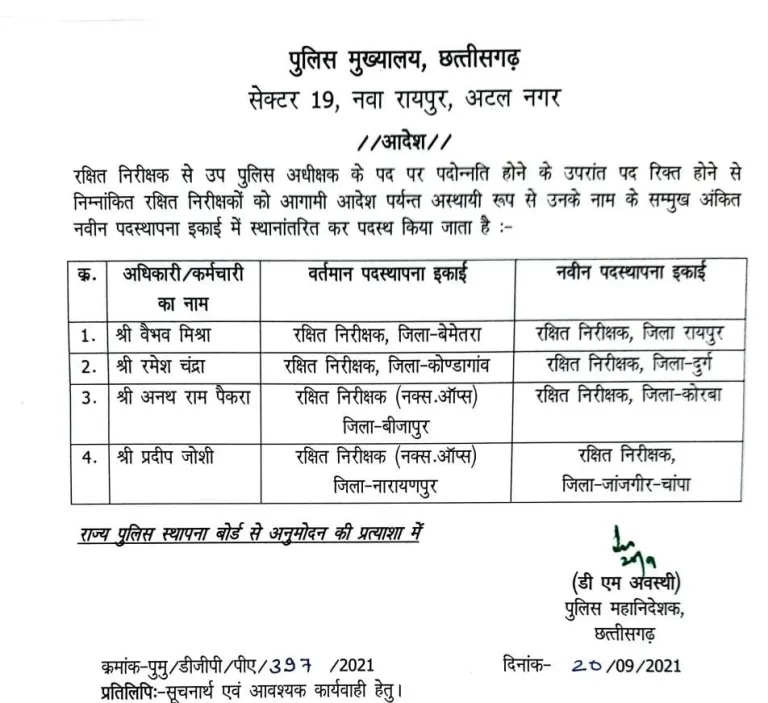 रायपुर (शोर संदेश)। निरीक्षक से डीएसपी के पदों पर प्रमोट हुए 4 रक्षित निरीक्षकों को पुलिस महानिदेशक डीएम अवस्थी ने अब नई जिम्मेदारी दी है। डीएसपी पदों पर प्रमोट हुए अफसरों को जिम्मेदारी देने के साथ रिक्त स्थानों पर नए निरीक्षकों को पदस्थ किया है। सोमवार को डीजीपी अवस्थी ने चार रक्षित निरीक्षकों को नई जिम्मेदारी दी है। रायपुर पुलिस लाइन की जिम्मेदारी डीजीपी अवस्थी ने वैभव मिश्रा को दी है। रायपुर के अलावा दुर्ग, कोरबा व जांजगीर में नए रक्षित निरीक्षक को नियुक्ति किया गया है। दुर्ग की जिम्मेदारी रमेश चंद्रा को, कोरबा की जिम्मेदारी अनथ राम पैकरा को और जांजगीर की जिम्मेदारी प्रदीप जोशी को दी है।