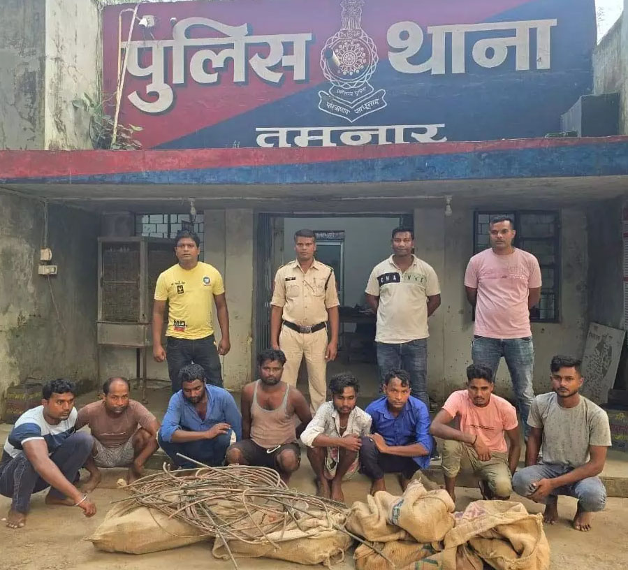 रायगढ़।( शोर संदेश ) पुलिस अधीक्षक दिव्यांग कुमार पटेल के दिशा-निर्देशन और एडिशनल एसपी आकाश मरकाम के मार्गदर्शन में, डीएसपी साइबर सेल अभिनव उपाध्याय के सुपरविजन के तहत तमनार थाने की टीम ने चोरी और लूट के मामलों में बड़ी सफलता हासिल की है। थाना प्रभारी आशीर्वाद राहटगांवकर के नेतृत्व में तमनार थाना पुलिस टीम ने आठ आरोपियों को गिरफ्तार किया, जो रेलवे लाइन के निर्माण कार्य से जुड़े तारों की चोरी में काफी समय से संलिप्त थे। मामले का विवरण: जानकारी के मुताबिक दिनांक 10 फरवरी 2023 को लगभग 4:00 बजे, पेट्रोलिंग टीम ने सूचना दी कि भालूमुड़ा एसपी के पास निर्माणाधीन रेलवे लाइन से 227 मीटर केटनरी तार और 227 कोन्टेक्ट तार , जिसकी कीमत लगभग ₹40,000 है, चोरी हो गई है। प्रार्थी पार्थ सारथी पंडा की रिपोर्ट पर अज्ञात आरोपी के खिलाफ धारा 379 आईपीसी के तहत अपराध क्रमांक 75/2023 दर्ज किया गया था। मामले की जांच के दौरान अज्ञात आरोपी और चोरी किए गए माल की पतासाजी के लिए लगातार प्रयास किए गए। लंबे समय तक अज्ञात आरोपियों के विरुद्ध कोई ठोस सबूत न मिलने के कारण प्रकरण में सितम्बर 2023 में खात्मा चाक की गई थी, लेकिन थाना प्रभारी आशीर्वाद राहटगांवकर के नेतृत्व में पुलिस टीम ने संदिग्धों से पूछताछ जारी रखी। आखिरकार, दिनांक 13 अक्टूबर 2024 को मुखबिर से सूचना प्राप्त हुई कि ग्राम कठरापाली के कुछ व्यक्ति रेलवे तार चोरी कर उसे बेचने की योजना बना रहे हैं।