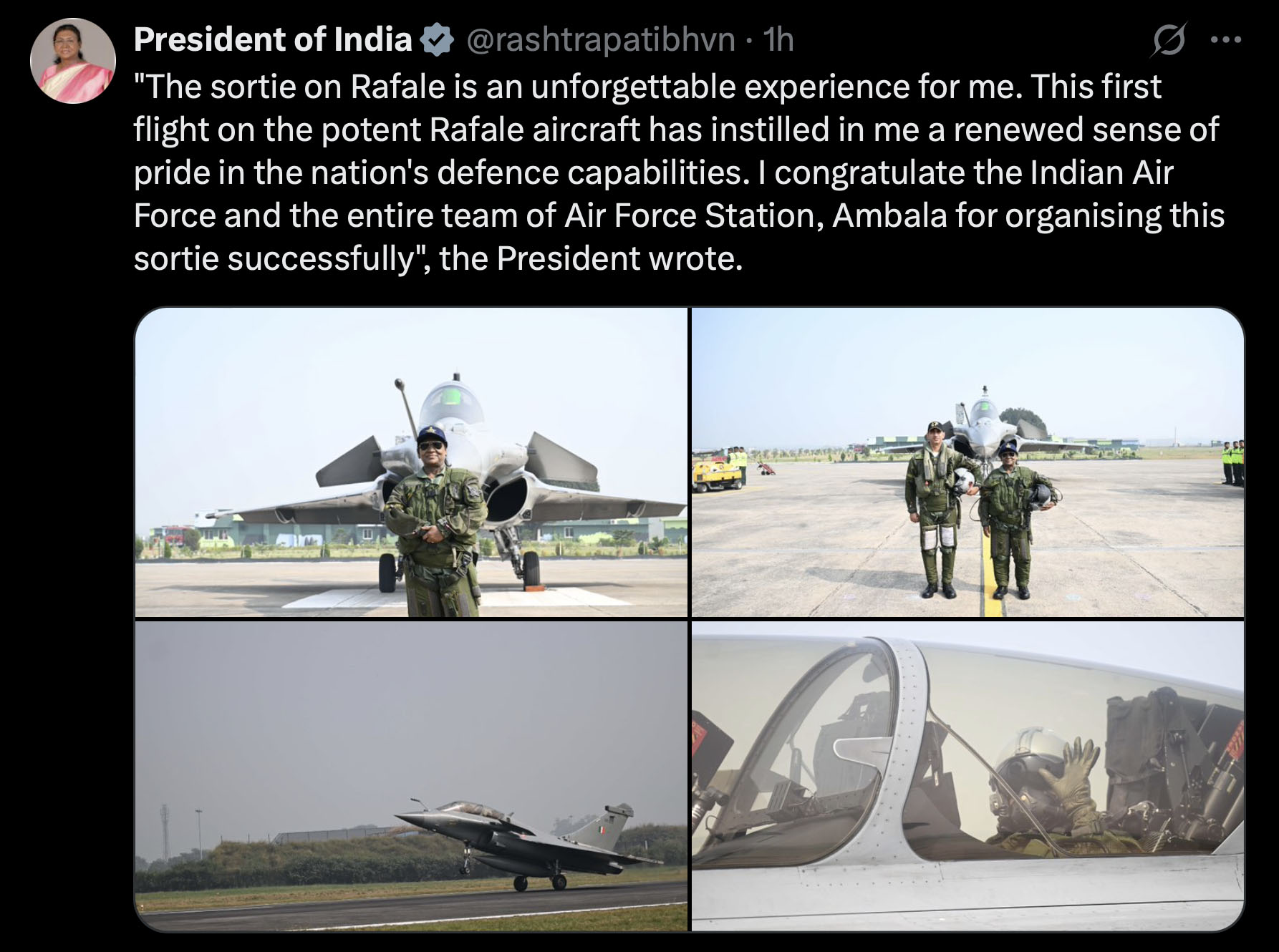 बाद में आगंतुक पुस्तिका में राष्ट्रपति ने एक संक्षिप्त नोट लिखकर अपनी भावनाएं व्यक्त कीं, जिसमें उन्होंने कहा कि भारतीय वायु सेना के राफेल विमान पर अपनी पहली उड़ान के लिए वायुसेना स्टेशन अंबाला आकर मुझे अत्यंत प्रसन्नता हो रही है। राफेल पर उड़ान मेरे लिए एक अविस्मरणीय अनुभव है। शक्तिशाली राफेल विमान पर इस पहली उड़ान ने मुझमें राष्ट्र की रक्षा क्षमताओं के प्रति गर्व की एक नई भावना भर दी है। मैं इस उड़ान के सफल आयोजन के लिए भारतीय वायु सेना और वायुसेना स्टेशन, अंबाला की पूरी टीम को बधाई देती हूं।