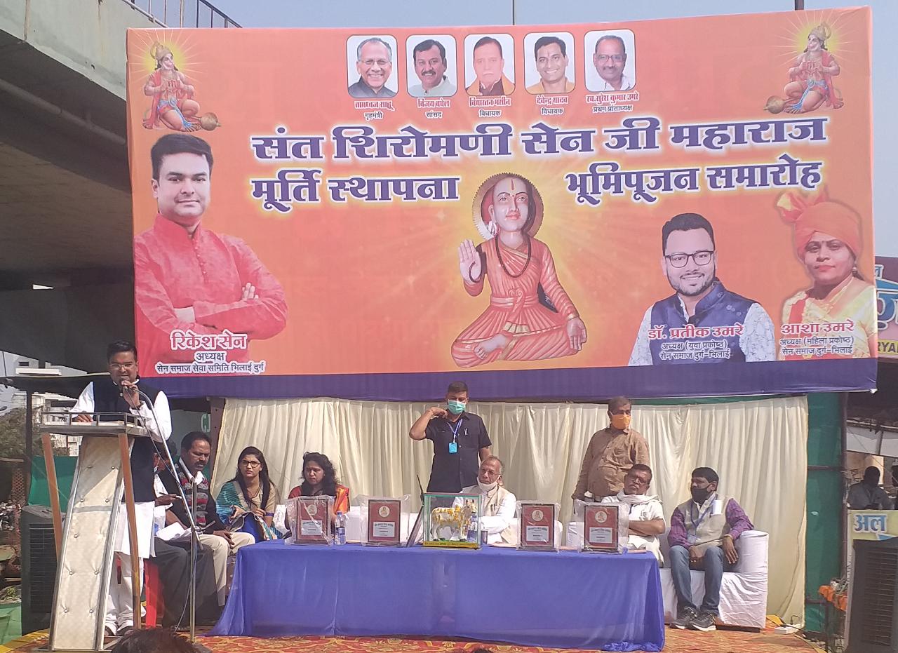 भिलाई (शोर सन्देश)। नेहरू नगर ओव्हरब्रिज के नीचे सेन सवा समिति द्वारा आयोजित संत शिरोमणि सेन जी महाराज के मूर्ति स्थापना और भूमिपूजन कार्यक्रम में पहुंचे प्रदेश के गृहमंत्री ताम्रध्वज साहू एवं समाज के प्रमुखों के बीच आज भूमिपूजन कार्यक्रम आज संपन्न हुआ। नेहरू नगर में संत शिरोमणि सेन जी महाराज की मूर्ति स्थापना के साथ ही यहां जनसेवा के लिए लोगों को पानी पिलाने के लिए प्याऊ घर खोला जायेगा। इसके अलावा संजय नगर तालाब में भी सेन जी महाराज की मूर्ति लगाई जायेगी। इस दौरान लोगों को संबोधित करते हुए गृहमंत्री ताम्रध्वज साहू ने कहा कि संत शिरोमणि सेन जी महाराज सेन समाज के संत और उनके पुरोधा है, लोगों को सेन जी महाराज के आदर्शों को आत्मसात करना चाहिए। कुछ वर्ष पहले लिटिया में मेरे द्वारा इनकी मूर्ति लगवाई गई थी, किसी भी व्यक्ति को राजनीति के साथ साथ सामाजिक क्षेत्र में भी अपनी पकड़ मजबूत रखना चाहिए।राजनीति में व्यक्ति यदि अच्छा कार्य करता है तो लोग उसे अच्छा और गलत कहने वाले को यदि सुनना है तो मुक्तिधाम जाकर चुपचाप बैठ जाईये और सुनते रहिये कि कौन क्या कह रहा है, और कैसा है तथा कैसा था? श्री साहू ने आगे कहा कि मैं वर्ष 1990 से साहू समाज और अन्य समाज के लोगों को साथ लेकर चल रहा हूं, राजनीति के साथ साथ समाजिक क्षेत्र में काम करना मुझे काफी अच्छा लगता है, मैं चार बार विधायक, और सांसद रहा तथा आज मैं मंत्री हूं लेकिन पद में रहो तो सबलोग जिंदाबाद कहते हैं, वही जब पद से हट जाओं तो यदि आपने आदमी और व्यवहार कमाया है तो जो आपके पीठ पीछे जो आपकी तारीफ करे, तो समझों कि आने अच्छा काम किया है। उन्होंने आगे कहा कि समाज में हमें ज्यादा काम करना चाहिए। सभी सामाजिक संगठनों के लिए उनके समाज प्रमुखों से अपील करता हूं कि वे उसे मजबूत करें। उन्होंने कार्यक्रम में पहुंचे महापौर और विधायक देवेन्द्र यादव की भी जमकर तारीफकी। कहा कि देवेन्द्र अपने निगम को तो भरपूर चमका रहा हैं, लेकिन मेरे रिसाली निगम को भी देवेन्द्र विकास कार्य कराये, वह अक्सर ये कहता हैं कि आपके पुत्र जितेन्द्र साहू को साथ लेकर क्षेत्र का दौरा कर विकास कार्य कराऊंगा। देवेन्द्र जब तक मेरे रिसाली निगम को आगे नही बढायेंगे तब तक मैं उसे छेलूंगा। कार्यक्रम के अंत में प्रदेश के गृहमंत्री ताम्रध्वज साहू ने मीडिया से चर्चा करते हुए खुड़मुड़ा में गत रविवार सोमवार की दरम्यिानी रात हुआ घटना बेहद ही दुखदायक है, चार लोगों की जो मौत हुई है। इस मामले की जांच पुलिस तेजी से कर रही है, भले ही समय लग रहा है, लेकिन अपराधी कोई भी हो शीघ्र ही पुलिस की पकड़में होगी। किसी भी बिल्डर्स या किसी भी व्यक्ति को पुलिस बचाने का कार्य नही कर रही है। विपक्ष द्वारा विधानसभा में उठाये 