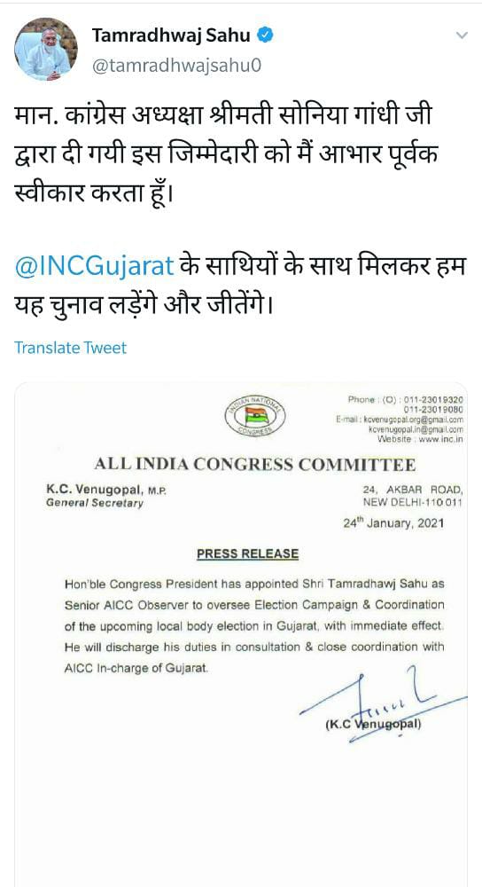 रायपुर (शोर सन्देश)। छत्तीसगढ़ के गृहमंत्री ताम्रध्वज साहू को एआईसीसी ने बड़ी जिम्मेदारी दी है। एआईसीसी के महासचिव केसी वेणुगोपाल ने प्रेस विज्ञप्ति जारी इसकी जानकारी दी है। गृहमंत्री साहू को कांग्रेस ने गुजरात लोकल बॉडी इलेक्शन का सीनियर ऑब्जर्वर नियुक्त किया है। पार्टी की ओर से मिले इस दायित्व के लिए ताम्रध्वज साहू ने पार्टी के प्रति अपनी कृतज्ञता व्यक्त की है।