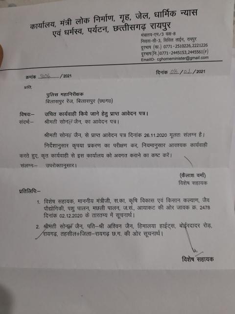सोनल जैन ने उक्त मामले की शिकायत गृह मंत्रालय एवं मानव अधिकार आयोग में किया, जिस शिकायत पर जांच प्रतिवेदन का जिम्मा अब रेंज बिलासपुर संभाग आईजी रतन लाल डांगी को सौपा गया है। अब आने वाले समय में देखना होगा कि महिला अपराध के प्रति गम्भीरता के दावे कर चुके बिलासपुर आईजी क्या पुलिस विभाग के एसपी सहित जिम्मेदार पदों पर बैठे अधिकारियों पर लगे गम्भीर मामले में निष्पक्ष जांच कर अपने ही विभाग के आईपीएस अधिकारी पर कार्रवाई कर पाते हैं या फिर ऊंची रसूख एवं पहुंच का लाभ देकर महिला सहायक अभियंता के मामले में सिर्फ लीपापोती की जाती है। फिलहाल लगातार रायगढ़ पुलिस कप्तान के विरुद्ध कार्रवाई के लिए बिलासपुर आईजी को 3 पत्र मिलने से पुलिस कप्तान रायगढ़ संतोष सिंह की मुश्किलें बढ़ती नजर आ रही है। वहीं महिला अपराध पर गम्भीरता से मामला दर्ज करने का फरमान जारी करने वाले आईजी बिलासपुर के लिए उनके ही विभाग के जिम्मेदार अधिकारियों के उक्त गैर जिम्मेदाराना हरकत से फिर एकबार खाखी पर दाग लगा है। अब इस मामले पर क्या कार्रवाई होती है इसपर सभी की निगाहें टिकी हुई है।