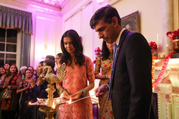 लंदन (शोर संदेश) दिवाली से पहले, ब्रिटिश प्रधानमंत्री ऋषि सुनक और पत्नी अक्षता मूर्ति ने 10 डाउनिंग स्ट्रीट में अपने आधिकारिक आवास पर हिंदू समुदाय के सदस्यों के साथ मिलकर प्रकाश पर्व मनाया। सुनक के कार्यालय ने एक्स पर एक पोस्ट में लिखा, आज रात प्रधानमंत्री ऋषि सुनक ने अंधकार पर प्रकाश की विजय के उत्सव दिवाली से पहले डाउनिंग स्ट्रीट में हिंदू समुदाय के मेहमानों का स्वागत किया। इस सप्ताह के अंत में पूरे ब्रिटेन और दुनिया भर में मना रहे सभी लोगों के लिए शुभ दिवाली! प्रधानमंत्री कार्यालय ने कार्यक्रम की तस्वीरें भी साझा कीं, जिसमें सुनक को अपनी पत्नी के साथ पारंपरिक दीपक जलाते और बाद में मेहमानों का स्वागत करते और शुभकामनाएं देते दिखाया गया। पिछले साल सुनक भारतीय मूल और हिंदू समुदाय के ब्रिटेन के पहले प्रधानमंत्री बने थे। उन्होंने "एक ऐसा ब्रिटेन बनाने, जहां हमारे बच्चे और हमारे पोते-पोतियां अपने दीये जला सकें, इस काम में मैं जो कुछ भी कर सकता हूं" करने का संकल्प लिया। मूल रूप से पंजाब से संबंध रखने वाले सुनक ने कहा है कि उनकी हिंदू आस्था बहुत महत्वपूर्ण है क्योंकि यह तनाव के दौरान ताकत और लचीलापन देती है। इस साल सितंबर में नई दिल्ली में जी20 शिखर सम्मेलन के दौरान उन्होंने संवाददाताओं से कहा, मैं एक गौरवान्वित हिंदू हूं। इसी तरह मेरा पालन-पोषण हुआ, मैं ऐसा ही हूं। महामारी के दौरान 2020 में ब्रिटेन के वित्त मंत्री के रूप में सुनक ने डाउनिंग स्ट्रीट को दीयों से रोशन किया था।