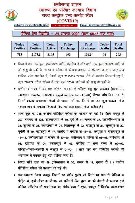 रायपुर (शोर सन्देश)। राज्य में कोरोना संक्रमण तेजी से फैल रहा है। प्रदेश में आज 755 कोरोना के नएम मरीज मिले है। वहीं मौतें भी छह हुई है। कोरोना बुलेटिन के अनुसार रायपुर में आज 207 मरीज मिले है। वहीं रायगढ़ में 125, राजनांदगांव में 59, दुर्ग में 41, बस्तर में 37, जांजगीर में 33, सुकमा में 28, कोंडागांव में 24, बिलासपुर में 22, बीजापुर में 21, सूरजपुर में 20, मुंगेली में 19, महासमुंद में 17, बालोद-धमतरी में 13-13, सरगुजा-नाराणपुर से 11-11, बलौदाबाजार-कांकेर से 10-10, कबीरधाम-कोरबा से 8-8, गरियाबंद से 5, दंतेवाड़ा से 4, बलरामपुर में 3, कोरिया से दो, मरवाही और जशपुर से एक-एक मरीज मिले है। वहीं अब तक 21 हजार 732 केस मिले है। इसके अलावा अब एक्टिव केस की संख्या 8105 पहुंच चुकी है। साथ ही 493 मरीज डिस्चार्ज भी हुए है। अब मौत का आंकड़ा 203 पर पहुंच गया है। वहीं महामाया पारा निवासी 57 वर्षीय व्यक्ति की मौत हुई है। राजेंद्र नगर में 88 वर्षीय बुजुर्ग ने दम तोड़ा है। संजय नगर में 70 वर्षीय व्यक्ति की मौत हुई है। इसके अलावा पखांजूर में 58 वर्षीय महिला की जान चले गई है। पाली में 42 वर्षीय व्यक्ति की मौत हुई है। रायपुर के ब्रम्हपुरी में 60 वर्षीय व्यक्ति की जान गई है।