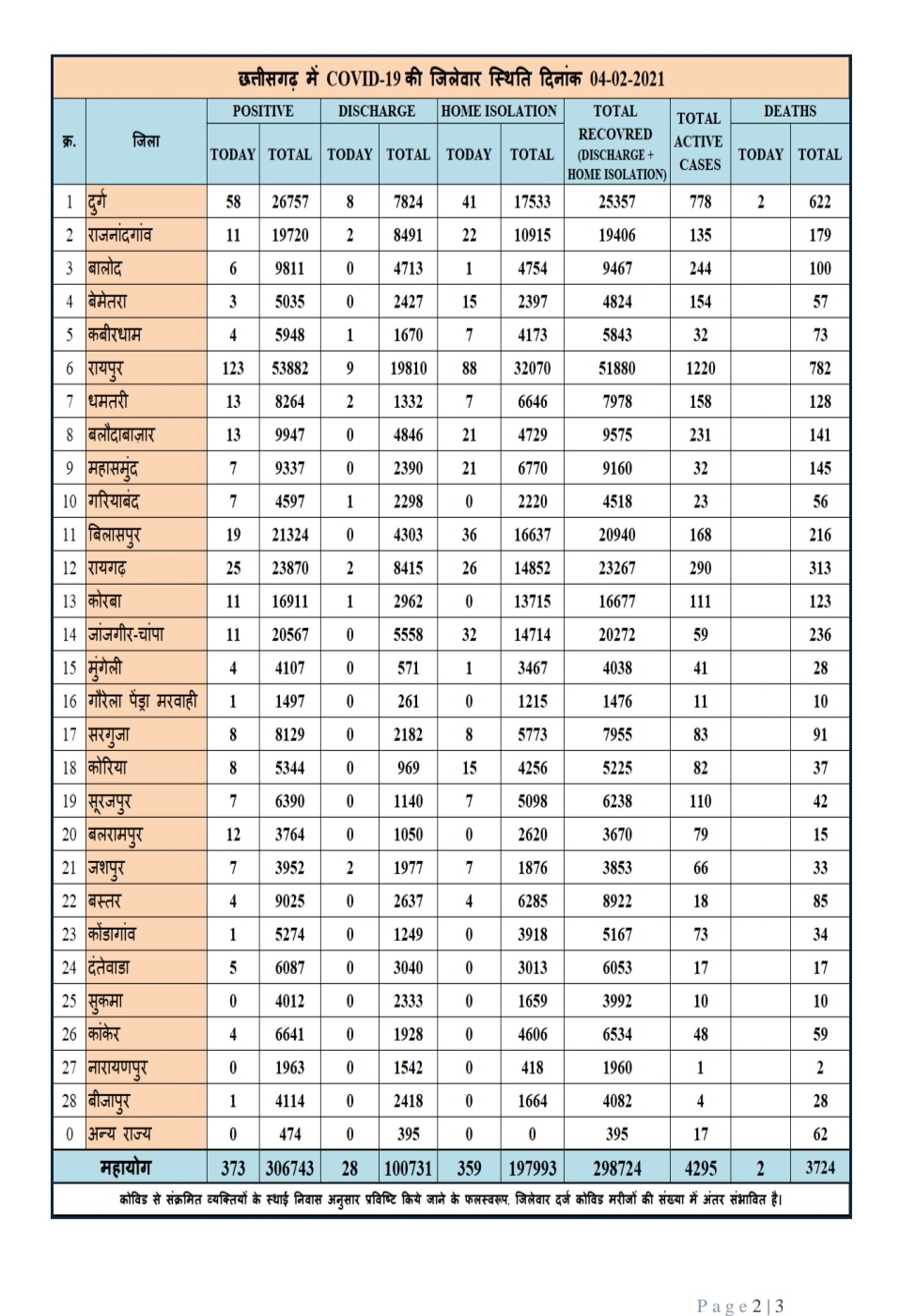 रायपुर (शोर सन्देश)। स्वास्थ्य विभाग के दैनिक बुलेटिन से प्राप्त आंकड़ों के अनुसार प्रदेश में आज 373 नए कोरोना पॉजिटिव मरीज़ों की पहचान हुई। वहीं 387 मरीज़ स्वस्थ होने के उपरांत डिस्चार्ज हुए। राज्य में एक्टिव मरीज़ों की संख्या 4,295 है। राजधानी रायपुर में आज 123 नए मामलों की पुष्टि हुई है। आज दर्ज दोनों मौत को-मोर्बिडिटी श्रेणी की है।