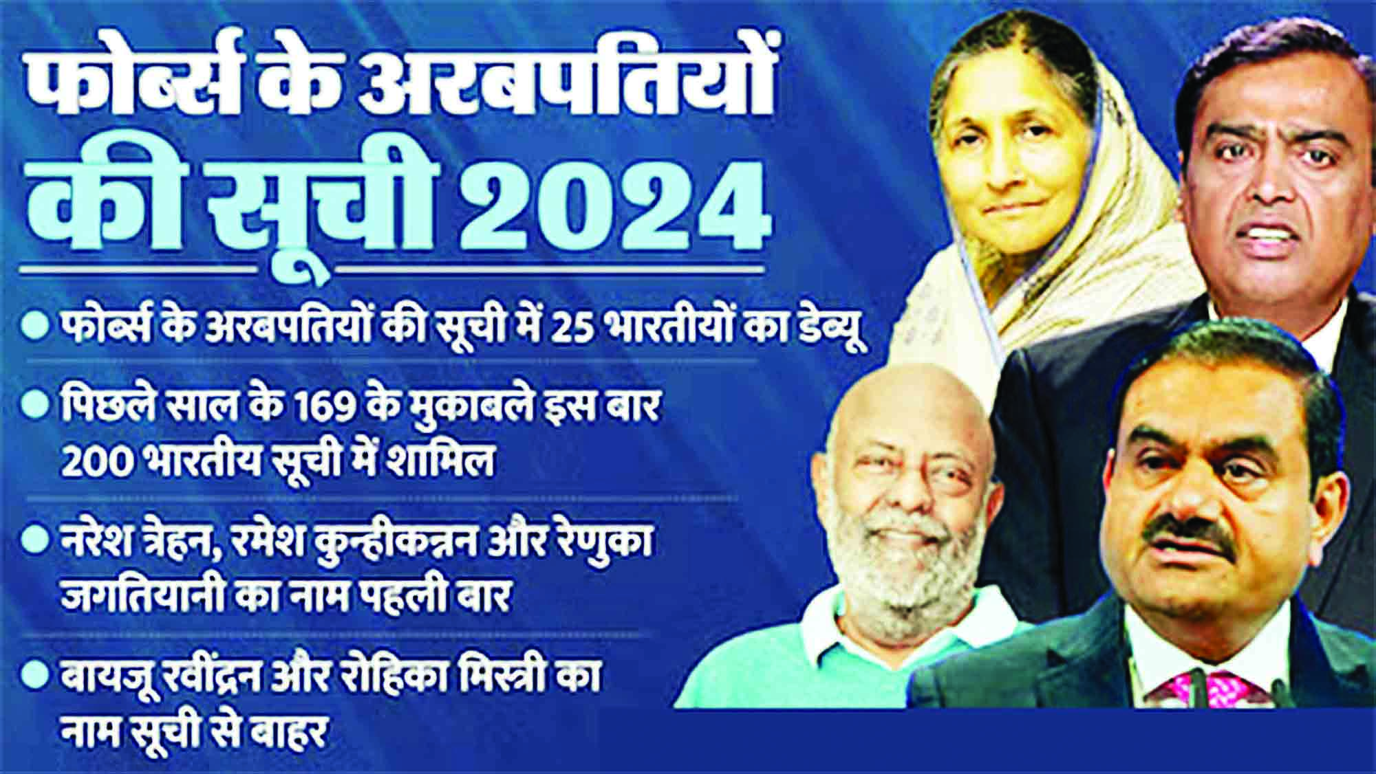 नई दिल्ली ( शोर सन्देश ) । फोर्ब्स की विश्व के अरबपतियों की 2024 की सूची में इस बार 200 भारतीयों के नाम शामिल हैं। पिछले साल इसमें 169 भारतीयों का नाम था। इन भारतीयों की कुल संपत्ति 954 अरब डॉलर है, जो पिछले साल के 675 अरब डॉलर से 41 फीसदी अधिक है।