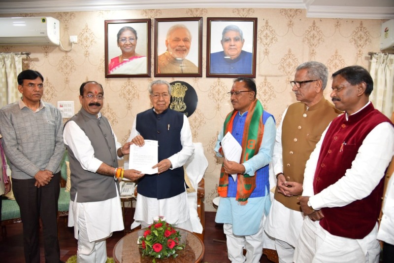 रायपुर (शोर सन्देश)। राज्यपाल विश्वभूषण हरिचंदन को रविवार को राजभवन में भाजपा प्रदेश अध्यक्ष अरूण साव ने वर्ष 2023 की छत्तीसगढ़ राज्य नव गठित विधानसभा के अपनेे नव निर्वाचित विधायकों की सर्वसम्मति से, प्रदेश विधायक दल का नेता विष्णुदेव साय को चयनित किये जाने संबंधित पत्र सौंपा और नई सरकार बनाने के लिए अपना दावा प्रस्तुत किया। राज्यपाल हरिचंदन ने विष्णुदेव साय को बधाई एवं शुभकामनाएं दीं। उन्होंने भारत के संविधान की धारा 164 के तहत विष्णुदेव साय को मुख्यमंत्री नियुक्त करने संबंधित पत्र प्रदान किया और केबिनेट गठन के लिए आमंत्रित किया।
