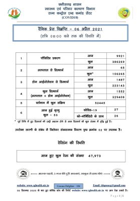 स्वास्थ्य मंत्री टी एस सिंहदेव ने राज्य में कोरोना संक्रमण के प्रसार पर कहा कि मार्च माह के पहले सप्ताह में राज्य की पॉजिटिविटी रेट 0.99 प्रतिशत पर था, जिसके उपरांत दूसरे सप्ताह में यह थोड़ा बढ़कर 1.6 प्रतिशत पर पहुंचा एवं तीसरे सप्ताह तक यह 1.8 प्रतिशत और चौथे सप्ताह में यह 6 प्रतिशत पर चला गया है। उन्होंने कहा कि 1 प्रतिशत से 6 प्रतिशत तक यह बढ़ते संक्रमण की दर बड़ी चिंता का विषय है।