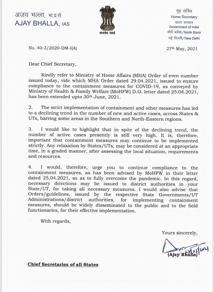 रायपुर (शोर सन्देश)। देश में कोरोना संक्रमण के दूसरे वेव के बाद अब कई राज्यों में संक्रमण कमजोर पड़ने लगा है, लेकिन देश में कोरोना की दूसरी लहर की तबाही को मद्देनजर रखते हुए केंद्र सरकार के गृह सचिव अजय भल्ला ने सभी राज्यों के मुख्य सचिवों को पत्र लिखकर, राज्यों में 30 जून तक लॉक डाउन बढ़ने के निर्देश दिए हैं। इससे छत्तीसगढ़ में सोमवार 31 मई को खत्म होने वाली लॉक डाउन की अटकलें ख़त्म हो गई है, अब छत्तीसगढ़ में भी 30 जून तक लॉक डाउन लागू रहेगा। हालाँकि राज्य सरकार की तरफ से समाचार लिखे जाने तक केंद्र सरकार के पत्र पहुंचे लगभग 3 दिन हो गए फिर भी कोई नया आदेश जारी नहीं किया गया है। वैसे आगे की नई गाइडलाइन और नई तारीखें कलेक्टर जारी करेंगे। माना जा रहा है कि वर्तमान में दी जा रहीं रियायतें जारी रहेंगी। केंद्र सरकार ने राज्यों में आवागमन की छूट दी है, बावजूद इसके राज्य सरकार ने अपनी सीमाओं को नहीं खोलने का फैसला लिया है। गाइडलाइन के मुताबिक पहले की तरह 30 जून तक लॉकडाउन जारी रहेगा। यानी अन्य राज्यों से आने वाले लोगों के लिए ही ई-पास अनिवार्य होगा। यही व्यवस्था अंतर जिला आवागमन के लिए लागू होगी। प्रदेश में 7 जून तक धार्मिक स्थल, शॉपिंग मॉल, सिनेमा हॉल, स्वीमिंग पूल, स्पा, शैक्षणिक संस्थान, भीड़ भरे आयोजन पर रोक रहेगी। इसके अलावा नाइट कर्फ्यू और रविवार को पूर्ण लॉकडाउन की व्यवस्था भी अगले आदेश तक जारी रहेगा। वहीं रोजमर्रा की सभी दुकानें सुबह छह से शाम छह बजे तक तथा देसी शराब दुकानें रात आठ बजे तक ही खोली जा सकेंगी। जीएडी सचिव का कहना है कि राज्य सरकार की नई गाइडलाइन सोमवार को जारी होगी तथा यह मंगलवार 1 जून से प्रभावशील होगी। पूर्व की तरह जिले के कलेक्टर अपने जिलों में संक्रमण की दर को ध्यान में रखकर ही दिशा-निर्देश जारी करेंगे।इसके पहले राज्यों और केंद्र शासित प्रदेशों के मुख्य सचिवों को जारी अपने आदेश में केंद्रीय गृह सचिव ने कहा कि स्थानीय हालात, जरूरत और स्रोतों का आकलन करने के बाद राज्य और केंद्र शासित प्रदेश उचित समय पर चरणबद्ध तरीके से पाबंदियों में किसी तरह की रियायत देने पर विचार कर सकते हैं, उन्होंने कहा कि मई महीने के लिए 29 अप्रैल को जारी किए गए दिशा-निर्देश 30 जून तक लागू रहेंगे। बयान के अनुसार जिन क्षेत्रों में मामलों की संख्या ज्यादा है, वहां जरूरी गतिविधियों को छोड़कर, रात के दौरान लोगों की आवाजाही पूरी तरह प्रतिबंधित होगी, इसमें कहा गया कि सामाजिक, राजनीतिक, खेल, मनोरंजन, शैक्षणिक, सांस्कृतिक, धार्मिक, त्योहार से संबंधित मौकों पर लोगों के जमा होने और सभाएं प्रतिबंधित हैं। शादी में 50 लोगों और अंतिम संस्कार में अधिकतम 20 लोगों के शामिल होने की इजाजत है, सभी शॉपिंग कॉम्प्लेक्स, सिनेमा 