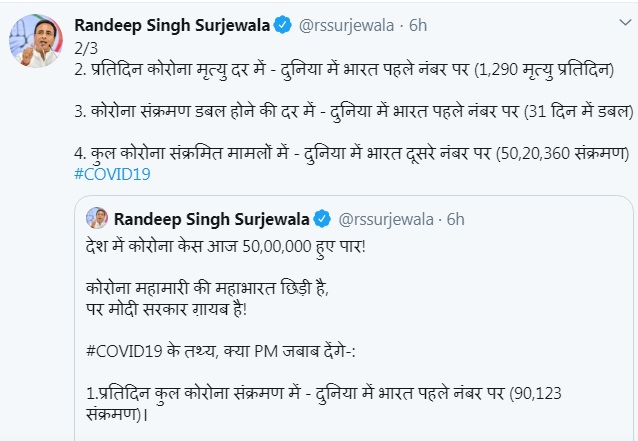 सुरजेवाला ने कहा, ``प्रतिदिन कुल कोरोना संक्रमण में दुनिया में भारत पहले नंबर पर (90,123 संक्रमण)। प्रतिदिन कोरोना मृत्यु दर में दुनिया में भारत पहले नंबर पर 1,290 मृत्यु प्रतिदिन कोरोना संक्रमण दोगुना होने की दर में में भी दुनिया में भारत पहले नंबर पर 31 दिन में दोगुना