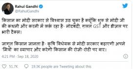 राहुल गांधी ने ट्वीट कर लिखा,`किसान का मोदी सरकार से विश्वास उठ चुका है क्यूंकि शुरू से मोदी की कथनी और करनी में फर्क रहा है- नोटबंदी, गलत GST और डीजल पर भारी टैक्स। जागृत किसान जानता है- कृषि विधेयक से मोदी सरकार बढ़ाएगी अपने `मित्रों` का व्यापार और करेगी किसान की रोजी-रोटी पर वार।`