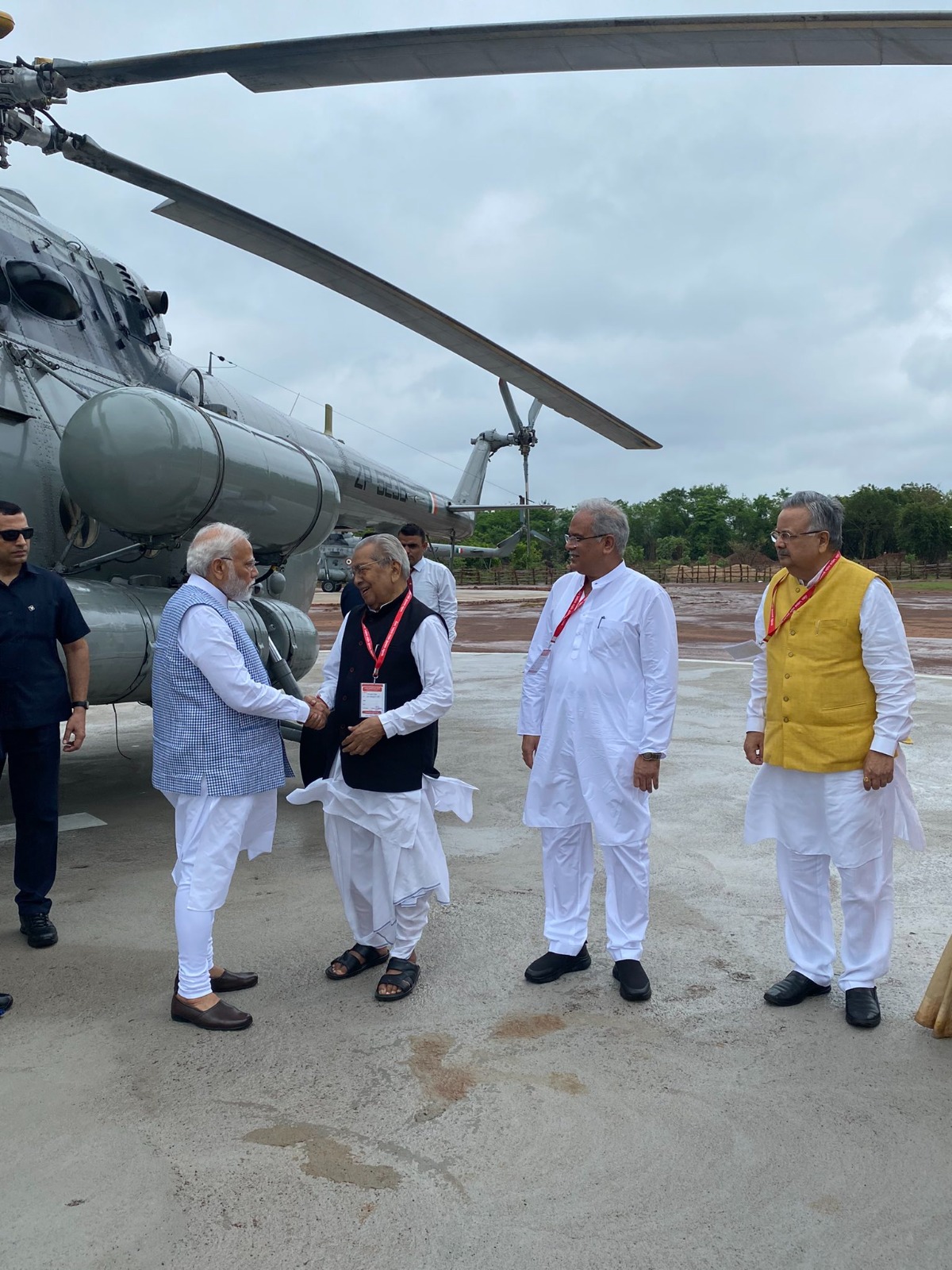 नरेंद्र मोदी करीब 2 घंटे रायपुर में रहेंगे। 12:40 के आसपास रायपुर से यूपी के गोरखपुर के लिए रवाना हो जाएंगे। राजधानी में हाईवे, रेलवे और स्वास्थ्य से जुड़े प्रोजेक्ट लॉन्च करेंगे। इसके अलावा छत्तीसगढ़ की जनता से संवाद करेंगे।नरेंद्र मोदी हेलीकॉप्टर से साइंस कॉलेज मैदान पहुंचे. जहां सीएम भूपेश बघेल ने उनकी अगवानी की. साथ ही डिप्टी सीएम टीएस सिंहदेव ने पीएम मोदी का स्वागत किया. इसके अलावा भाजपा नेताओं ने भी प्रधानमंत्री का स्वागत किया. साथ ही कलेक्टर और एसपी ने भी पीएम की अगवानी की. मोदी का हेलीकॉप्टर पहुंचते ही कार्यकर्ताओं में जोरदार उत्साह देखा गया. इस दौरान कार्यकर्ताओं ने मोदी-मोदी के नारे लगाए.