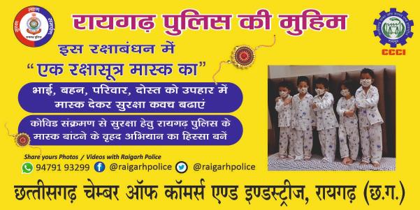 रायगढ़ (शोर सन्देश)। रायगढ़ पुलिस की मुहिम `एक रक्षा सूत्र मास्क का` कोविड-19 के संक्रमण काल में एक जन जागरूकता अभियान है जिसमें पुलिस ने इसे भावनात्मक टच देते हुए रक्षाबंधन के शुभ अवसर पर आगे बढ़ाया है। मास्क पहनने के प्रति लोगों को सजग करने के लिए एक महती पहल शुरू की गयी है जिसमें भाई-बहन परिवार दोस्त सब एक-दूसरे को उपहार में मास्क देकर कोरोनावायरस से बचने का एक संदेश देंगे। रायगढ़ पुलिस की इस मुहिम में समाजसेवी संस्थाएं और जागरूक नागरिक उद्योग व्यापार जगत भी अब आगे आया है चेंबर ने इस मुहिम में 20000 मास्क बांटने का संकल्प लिया है। जिसमें से 10000 मास्क वे पुलिस को सौंपेंगे तथा 10000 मास्क अपने सदस्यों के माध्यम से उनके संस्थानों में आने जाने वालों और संस्थानों के अंदर काम करने वाले कर्मचारी भाइयों को बांटा जाएगा। इसी कड़ी में चेंबर की खरसिया, सारंगढ़, बरमकेला सरिया, इकाई तथा चेंबर के विभिन्न व्यापारिक एसोसिएशन भी पृथक रूप से अपना सहयोग पुलिस की इस मुहिम में दे रहे हैं। कुल मिलाकर रायगढ़ का जनमानस पुलिस की इस मुहिम में शामिल हो चुका है और सभी उत्साह पूर्वक इस काम में जुट गए हैं ताकि पूरे जिले की जनता तक यह संदेश पहुंचे कि कोरोनावायरस अगर बचना है तो केवल सावधानी ही एकमात्र उपाय है जिसमें मास्क पहनना, हाथों को सैनिटाइज करना, हाथ धोना, तथा भीड़भाड़ वाली जगहों पर नहीं जाना शामिल है। यदि कोई भी व्यक्ति और परिवार इस सावधानी को आत्मसात कर लेता है तो फिर कोरोना उन तक नहीं पहुंच पाएगा। रक्षाबंधन के दिन 11:00 बजे रामनिवास टॉकीज चौक से चेंबर की टीमें अलग-अलग दिशा में मास्क वितरण हेतु रवाना होंगी अत : सदस्यों से अनुरोध है कि वह समय पर आकर टीम के साथ मास्क लेकर अपने क्षेत्र में वितरण के काम में जुट जाएं और इसे सफल बनाये।रायगढ़ (वीएनएस)। रायगढ़ पुलिस की मुहिम `एक रक्षा सूत्र मास्क का` कोविड-19 के संक्रमण काल में एक जन जागरूकता अभियान है जिसमें पुलिस ने इसे भावनात्मक टच देते हुए रक्षाबंधन के शुभ अवसर पर आगे बढ़ाया है। मास्क पहनने के प्रति लोगों को सजग करने के लिए एक महती पहल शुरू की गयी है जिसमें भाई-बहन परिवार दोस्त सब एक-दूसरे को उपहार में मास्क देकर कोरोनावायरस से बचने का एक संदेश देंगे। रायगढ़ पुलिस की इस मुहिम में समाजसेवी संस्थाएं और जागरूक नागरिक उद्योग व्यापार जगत भी अब आगे आया है चेंबर ने इस मुहिम में 20000 मास्क बांटने का संकल्प लिया हजिसमें से 10000 मास्क वे पुलिस को सौंपेंगे तथा 10000 मास्क अपने सदस्यों के माध्यम से उनके संस्थानों में आने जाने वालों और संस्थानों के अंदर काम करने वाले कर्मचारी भाइयों को बांटा जाएगा। इसी कड़ी में चेंबर की खरसिया, सारंगढ़, बरमकेला सरिया, इकाई तथा चेंबर के विभिन्न व्यापारि