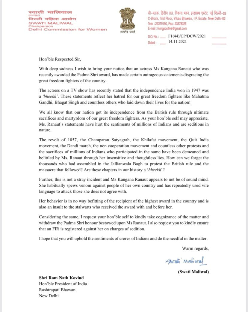नई दिल्ली (शोर संदेश)। दिल्ली राज्य महिला आयोग की अध्यक्ष स्वाति मालीवाल ने राष्ट्रपति रामनाथ कोविंद को पत्र लिखा है। अध्यक्ष ने पत्र में अभिनेत्री कंगना रनौत को दिए गए पद्मश्री पुरस्कार को वापस लेने की मांग की है। मालीवाल ने दलील दी है कि कंगना रनौत ने शहीदों का अपमान किया है, इसलिए उनसे पद्मश्री पुरस्कार वापस लिया जाए। स्वाति मालीवाल ने ट्वीट कर लिखा, कंगना रनौत ऐसी महिला है, जिसने महात्मा गांधी, भगत सिंह की शहादत मज़ाक़ लगती है और लाखों लोगों की त्याग तपस्या से हासिल आज़ादी भीख लगती है। इसको पुरस्कार की नहीं इलाज की ज़रूरत है।