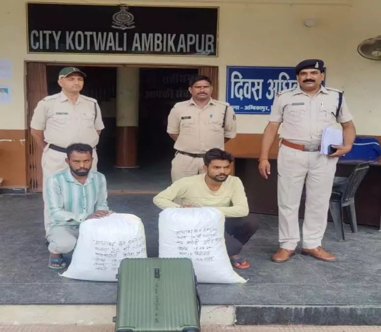अंबिकापुर। ( शोर संदेश ) ओडिसा से गांजा लाकर बनारस जाने बस की प्रतीक्षा कर रहे दो युवकों को अंबिकापुर की कोतवाली पुलिस ने गिरफ्तार किया है। इनके पास से कुल 22 किलोग्राम गांजा बरामद हुआ है। गिरफ्तार आरोपितों में दिनेश पासवान उर्फ़ छोटन (30) तथा प्रदीप पासवान उर्फ़ अलोक (20) निवासी मचवन पोस्ट तियरा थाना शाहबगंज जिला चंदौली उत्तरप्रदेश के रहने वाले हैं। स्वतंत्रता दिवस के दिन अंबिकापुर की कोतवाली पुलिस को मुखबिर से सूचना मिली थी। दो युवक अपने ट्रॉली बैग एवं एक अन्य बैग में गांजा लेकर नया बस स्टैंड रैन बसेरा के अंदर बनारस जाने वाली बस का इंतज़ार कर रहे हैं, सूचना पर पुलिस टीम द्वारा त्वरित कार्रवाई कर दोनों युवकों की घेराबंदी कर पकड़कर पूछताछ किया गया। पूछताछ में आरोपितों ने बताया कि वे ओडिसा से गांजा क्रय कर अंबिकापुर लाकर उत्तरप्रदेश बिक्री हेतु ले जा रहे थे। आरोपितों से पूछताछ में गांजा के अवैध कारोबार के संबंध में भी पुलिस को जानकारी मिली है। कार्रवाई में थाना प्रभारी कोतवाली निरीक्षक मनीष सिंह परिहार, उप निरीक्षक अखिलेश सिंह, सहायक उप निरीक्षक केके यादव, प्रधान आरक्षक देवनारायण नेताम, आरक्षक शिव राजवाड़े, मंटू गुप्ता, संजय तिवारी शामिल रहे।